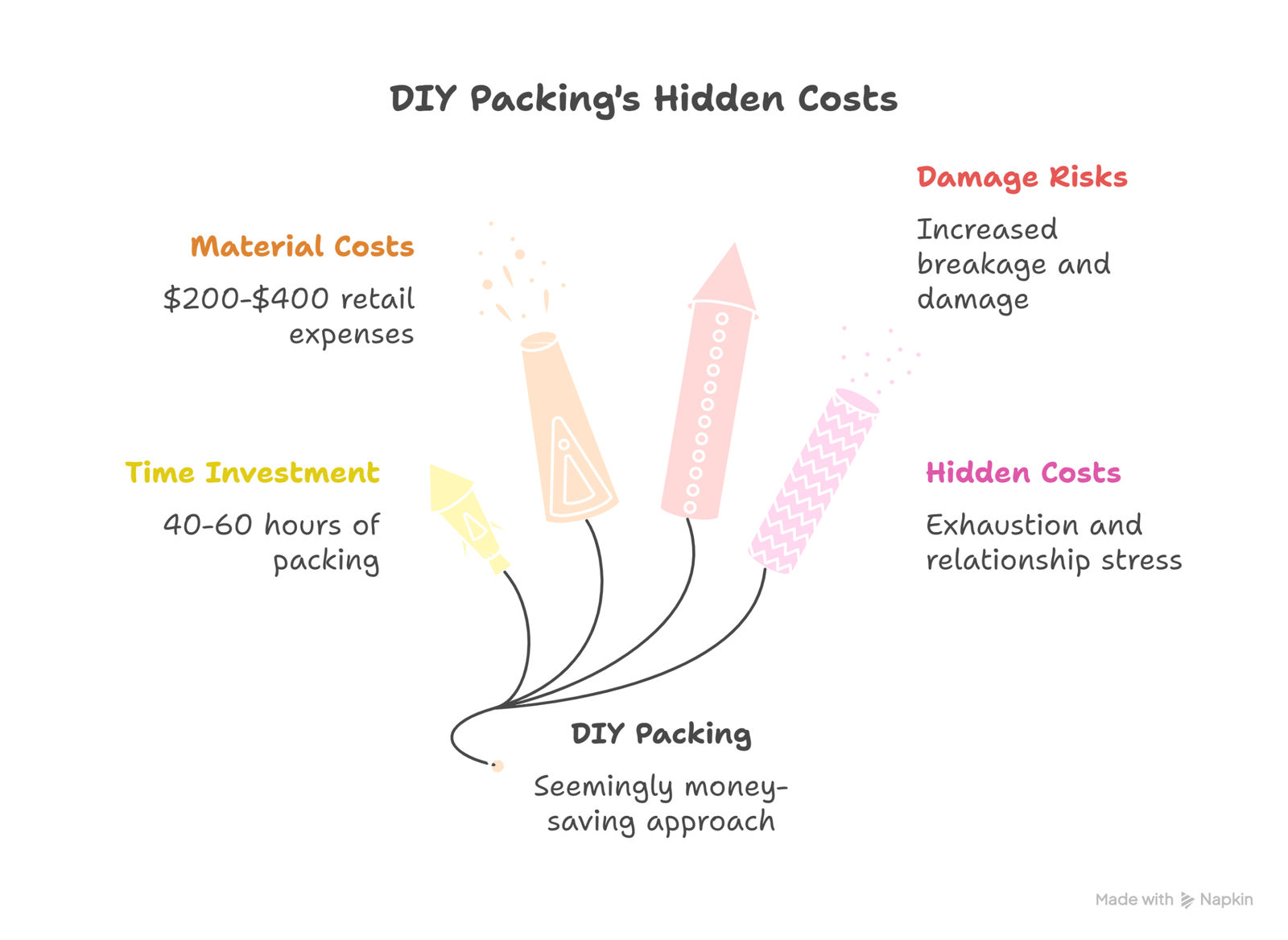 Hidden costs include physical exhaustion and relationship stress. Couples fight during stressful packing marathons. Family members get frustrated and irritable. Professional services eliminate this tension entirely.